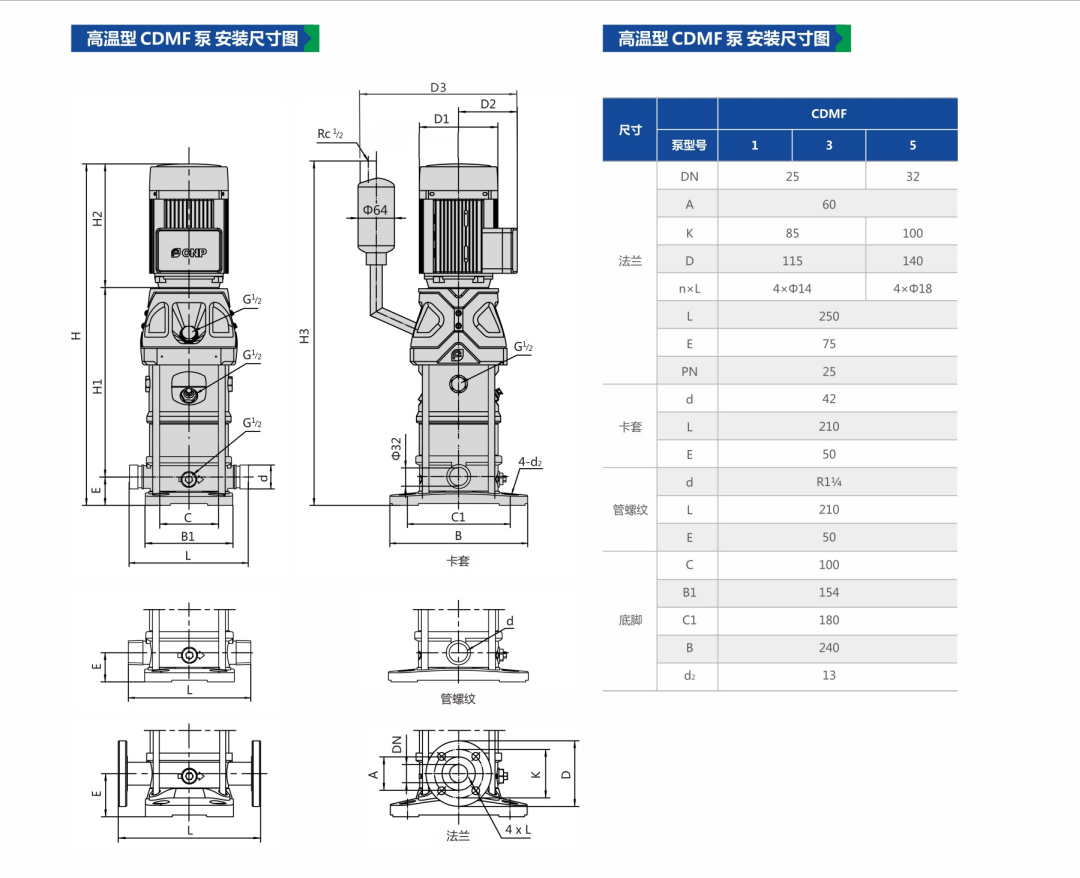 本產品在CDMF輕型立式多級離心泵的結構基礎上,增加了冷卻裝置,適用于最高溫度為+180℃的液體。液體流經冷卻裝置到達機封腔處可冷卻至+120℃或更低,有效保證機械密封的安全工作溫度,同時避免高溫對電機的損害影響。產品擁有CDMF的超高性能,MEI≥0.7。同時采用IE3超高效電機,使產品更加高效節能,綠色環保。