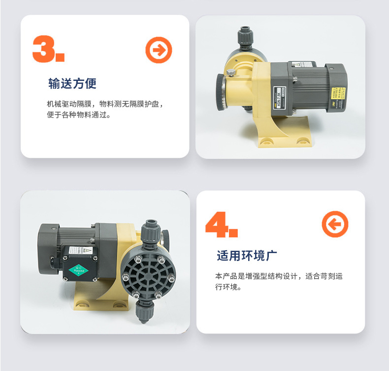 南方GW系列機械隔膜計量泵,采用減速電機傳動偏心輪推動隔膜往復運動。進出口單向閥采用雙閥球密封,確保計量精度。
