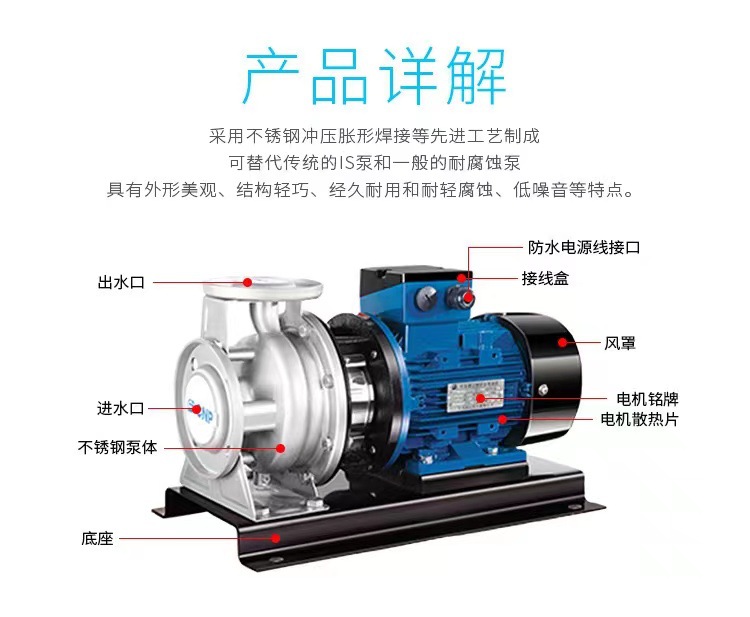 產品說明:南方zs不銹鋼臥式單級離心泵,泵體采用不銹鋼板沖壓脹形焊接工藝制成,可替代傳統的is泵和一般的耐腐蝕泵,軸向入口和徑向出口。