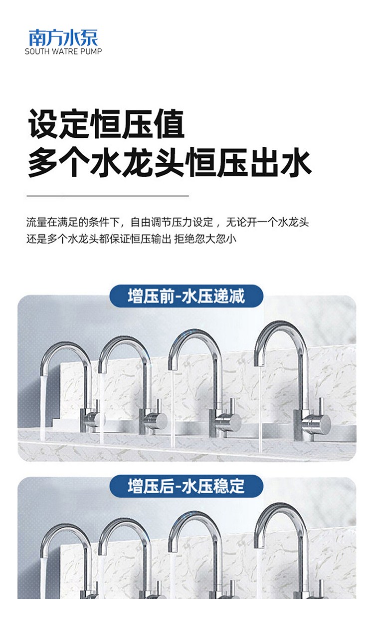 南方CHME系列臥式智能恒壓變頻泵采用了變頻調速及自動化控制相結合的技術,配合高效節能的CHM非自吸輕型臥式多級離心泵。整機主要由CHM泵、控制器、傳感器、壓力罐、五通止回閥及軸向抗震壓力表等組成。具有性能穩定、高效節能、全自動智能控制、低噪音、耐腐蝕、結構緊湊、外形美觀、體積小、重量輕等特點。